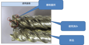 使用前の新品のエンドミルと使用済みで摩耗が発生している