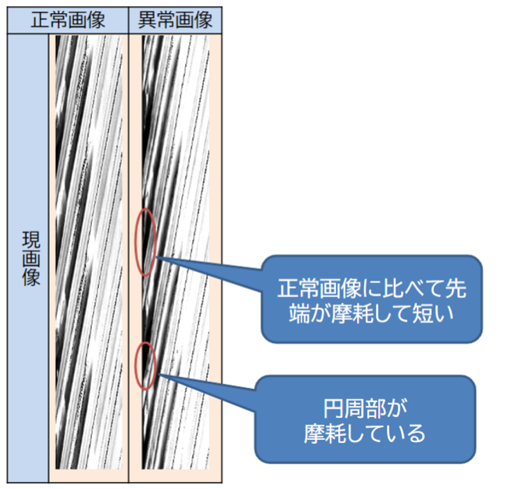 正常画像と異常画像の高さの差を検出することで摩耗を検出します。
