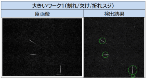 バックライト照明を当てることで割れ/欠けなど背景が見える欠陥に関して、照明の光を撮像するため、割れ/欠け部分を白色で検出する。緑色の円で囲まれた部分が欠陥として検出した部分になります。良好に検知できています。