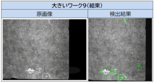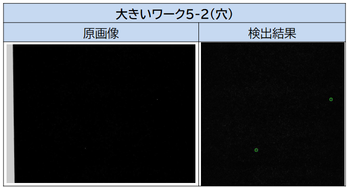 小さな穴でも良好に検知できています。ただし、この小さい穴が開いているワークは厚めのワークだったので、問題なかったのですが、薄めのワークでも同程度の穴を検出したい場合には、薄めのワークは密度が薄い部分は光を透過する箇所があるため、過検知または誤検知が発生する可能性がございます。