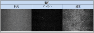 割れ/欠け/折れスジの検出にはバックライト照明で撮像した画像を使用して検出を行います。