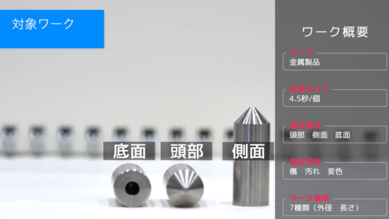 側面検査部では、ワークを回転させながら1秒間に21回転連続撮影、高速で画像処理を実施しています。歪みのないテレンセントリックレンズを使用し、将来的な寸法計測が可能です。