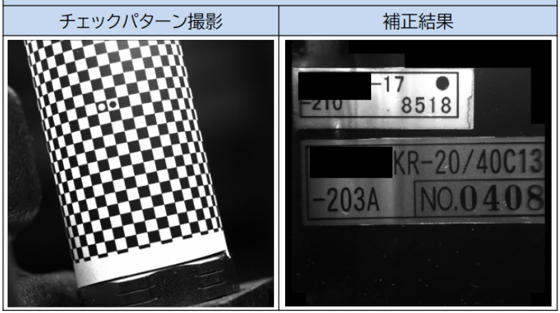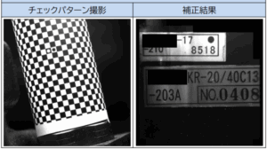 撮影された画像は、円柱物に貼られているためゆがみがあります。この状態で文字読み取りは困難であるため、チェックパターンを撮影し補正しています。