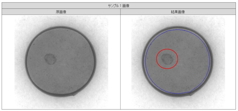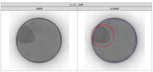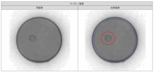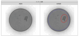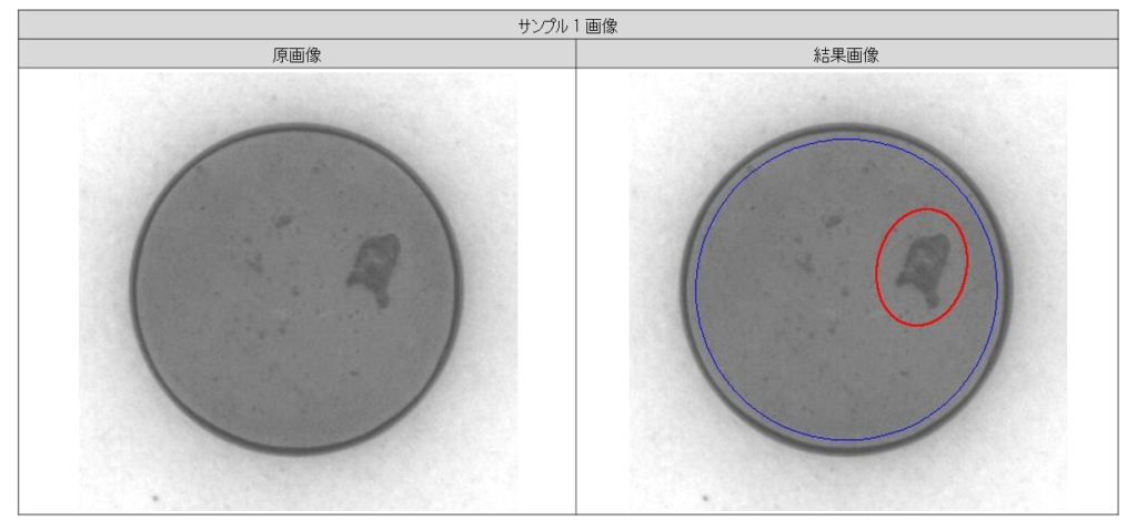 上面欠けの不良に関して、全サンプルを良好に不良検知しました。 検知方法としまして、結果画像の青色の線で囲まれた部分が検査範囲となり、一定以上の黒さの部分を欠陥として検知しております。 また検知結果の表示として、最も大きな欠陥を赤丸で囲って表示するようにしています。