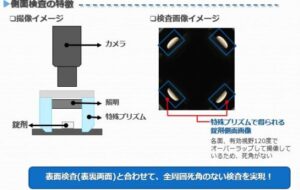 特殊プリズム、ローアングルリング照明、標準レンズを使用し、4側面を同時に撮影することで全周を一度に検査します。錠剤表面の汚れ(汚点・毛髪等)を最小100μm、欠けを最小200μmの大きさまで検知します。