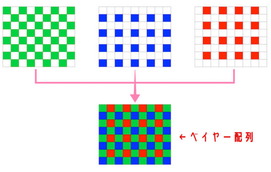 一般的なカメラの画素センサーは、1つの色調しか受光ができない様になっています。ベイヤー方式では、赤・青・緑 それぞれのイメージセンサーを疑似的に重ねることにより、いわば疑似的にカラー映像を表現する仕組みになっています。その結果、カラーにしたのはよいものの、撮影部分によってはボケるなどの副作用が出ることがあり、例えばキズや外観等の検査に悪い影響を及ぼすことがあります。